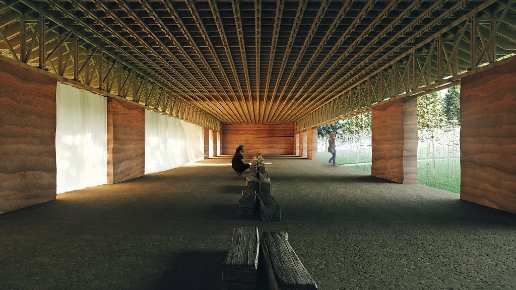 Excavation sites enhance the sense of place. The protection structures are low-key architectural interventions using simple wooden framework, rammed earth and a see-through Mosi fabric to allow visual connection with the surroundings. Archive photographs will be installed to retrace the original position of photographers. They act as portals to the trauma.